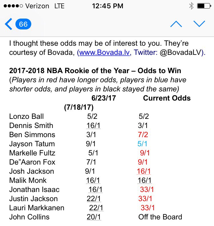 Lauri Markkanen at 33/1 odds to win NBA Rookie of the year per Bovada